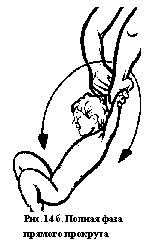 | "Прямые прокруты". Увеличиваем амплитуду раскачивания впередназад, пока малыш не будет совершать сальто назад между рук родителя (рис. 14а). В конечной фазе нужно развернуть свои запястья, уменьшив скручивающую нагрузку на ручки малыша (рис. 14б). Возврат в исходное положение осуществляется либо отпусканием одной из ручек ребенка, либо обратным движением. Это упражнение сначала нужно осваивать вдвоем, когда партнер медленно проводит ребенка по всей траектории. Затем с фиксированием в промежуточном положении, уперев ножки ребенка себе в грудь. | ![]() |