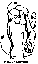 "Карусель". Это другой вариант развития "длинных раскачиваний", когда увеличение амплитуды "уводит" движение назад, переводя сначала в своеобразные "захлесты", а потом в полный горизонтальный круг, описываемый телом ребенка вокруг взрослого (руки взрослого переносятся над головой) (рис. 17). |